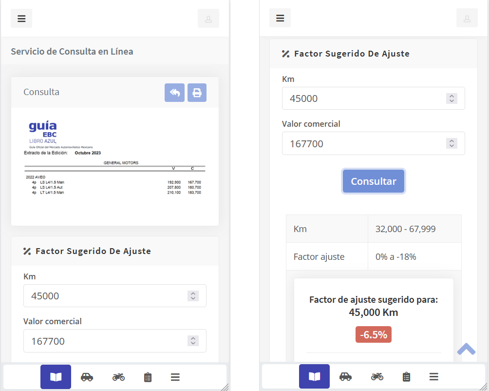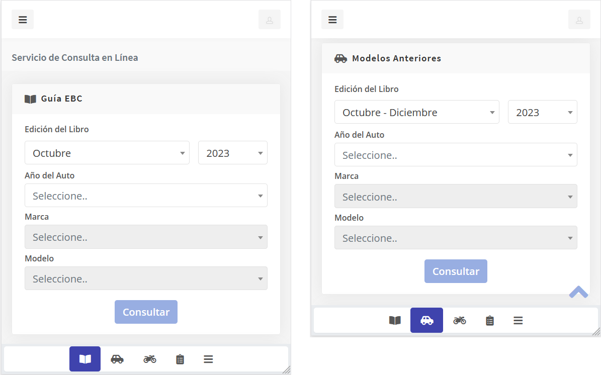 La versión para celular permite de una forma muy sencilla y rápida consultar los precios publicados en las ediciones de Guia EBC, Modelos Anteriores y Motocicletas.